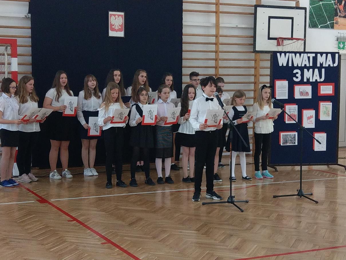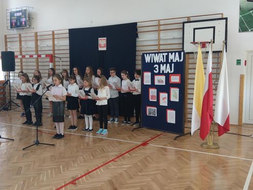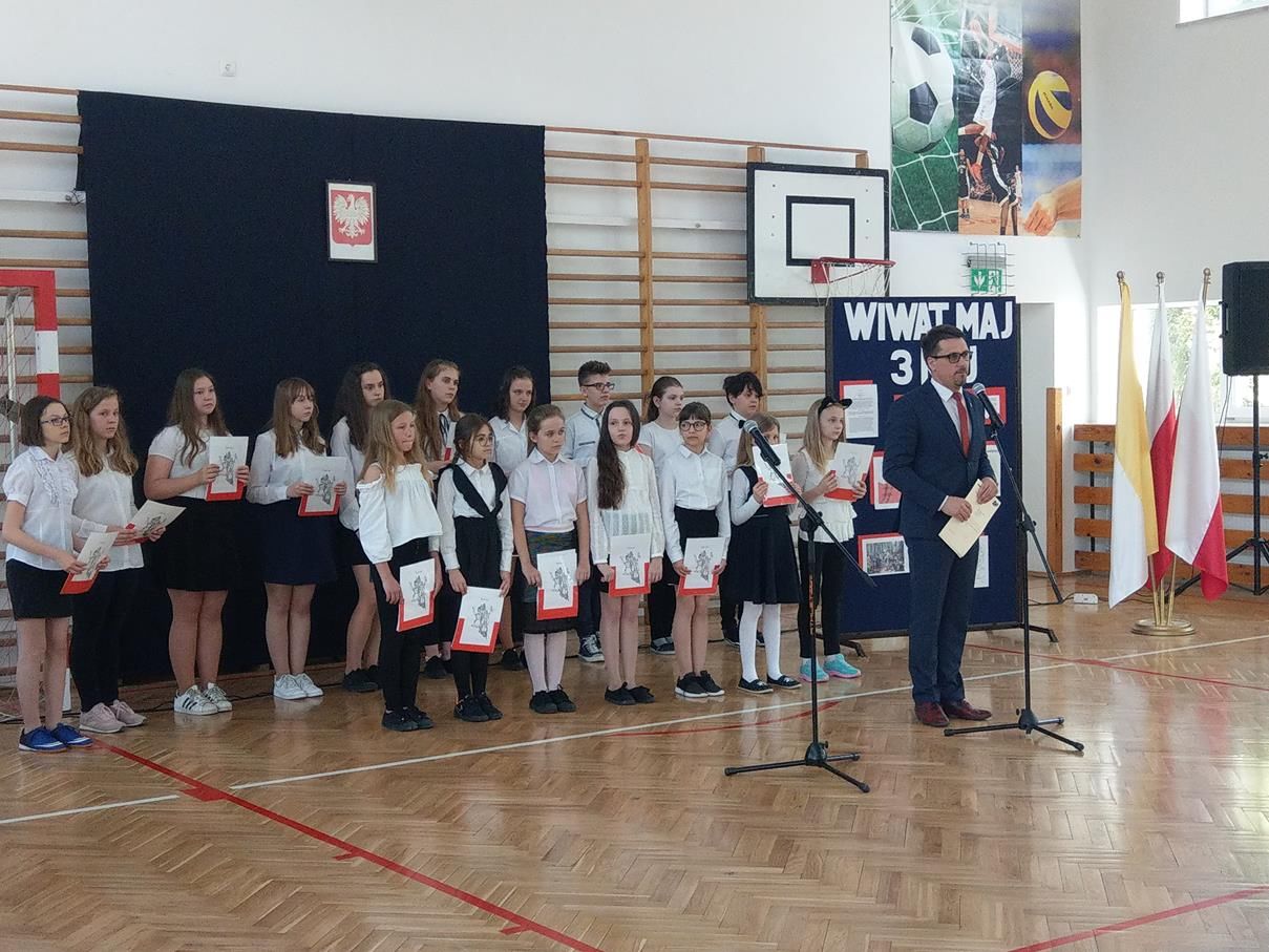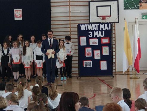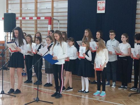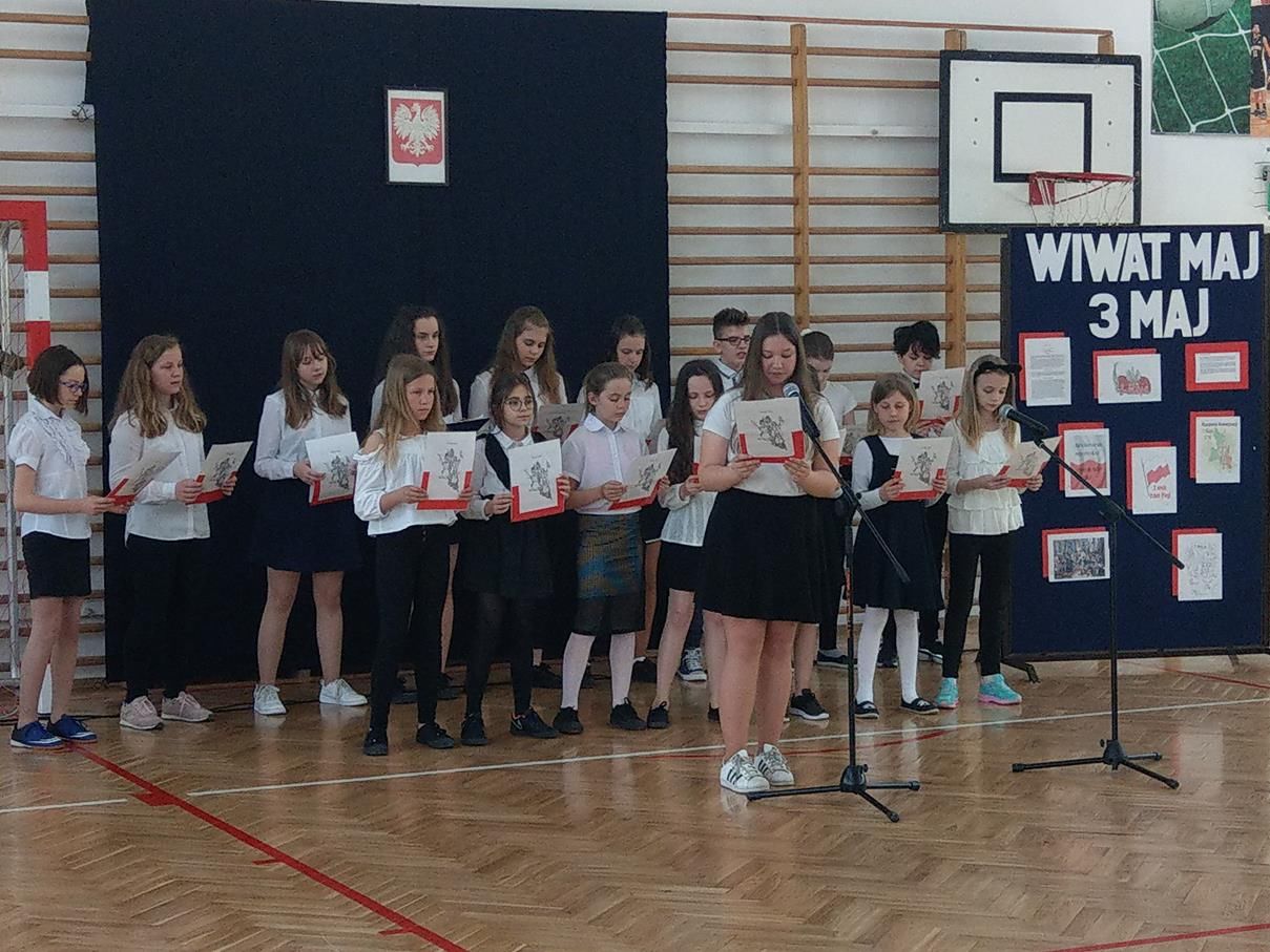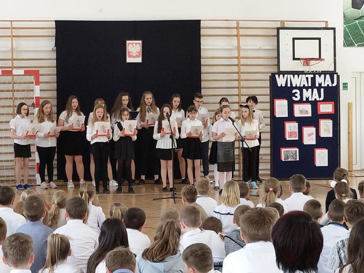 30 kwietnia 2019 roku w naszej placówce odbył się uroczysty apel z okazji Rocznicy Uchwalenia Konstytucji. Przygotowali go uczniowie klasy IV - VIII. Na apel zostały zaproszone dzieci z przedszkola oraz uczniowie ze szkoły i nauczyciele. Uczennice z klasy IVb recytowały wiersze o tematyce patriotycznej, które przeplatane były pieśniami patriotycznymi w wykonaniu chóru szkolnego. Była to dla wszystkich wspaniała lekcja historii, która dostarczyła wszystkim obecnym miłych wrażeń i wiedzy historycznej.