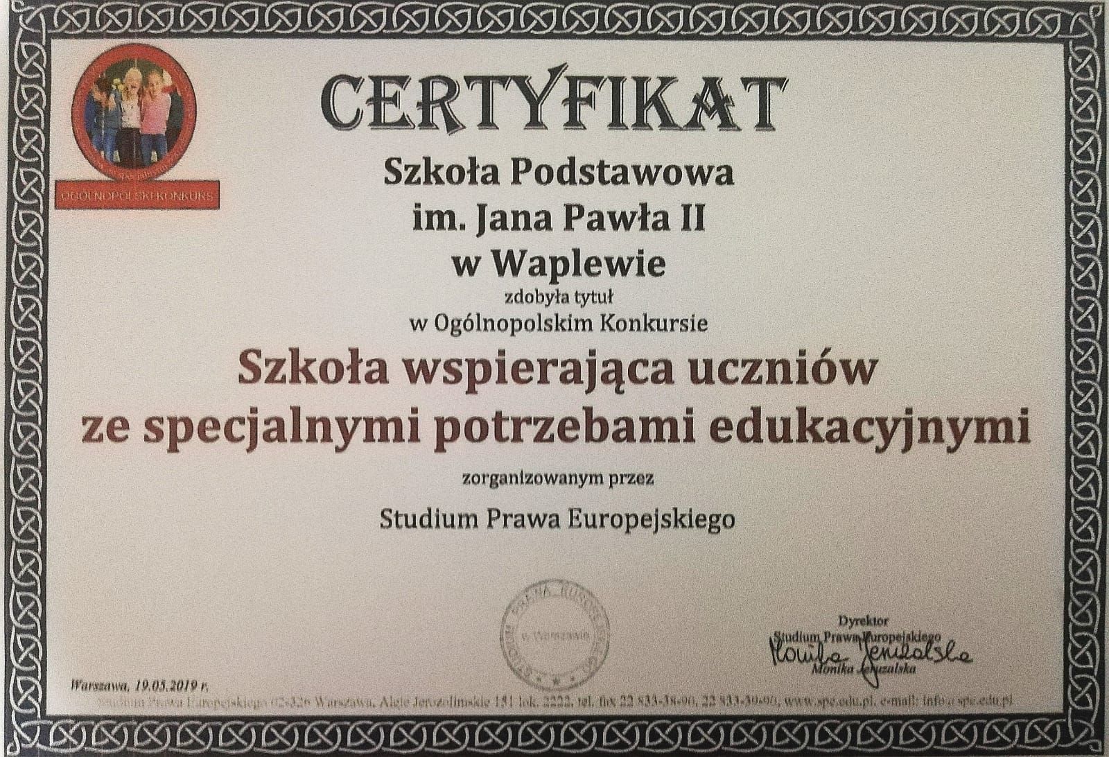 Od listopada 2018 r. do maja 2019 r. Szkoła Podstawowa im. Jana Pawła II w Waplewie brała udział w Ogólnopolskim Konkursie „Szkoła wspierająca uczniów ze specjalnymi potrzebami edukacyjnymi - V edycja”, zorganizowanym przez Studium Prawa Europejskiego w Warszawie. Celem konkursu było wspieranie i integrowanie uczniów ze specjalnymi potrzebami edukacyjnymi w środowisku szkolnym.
