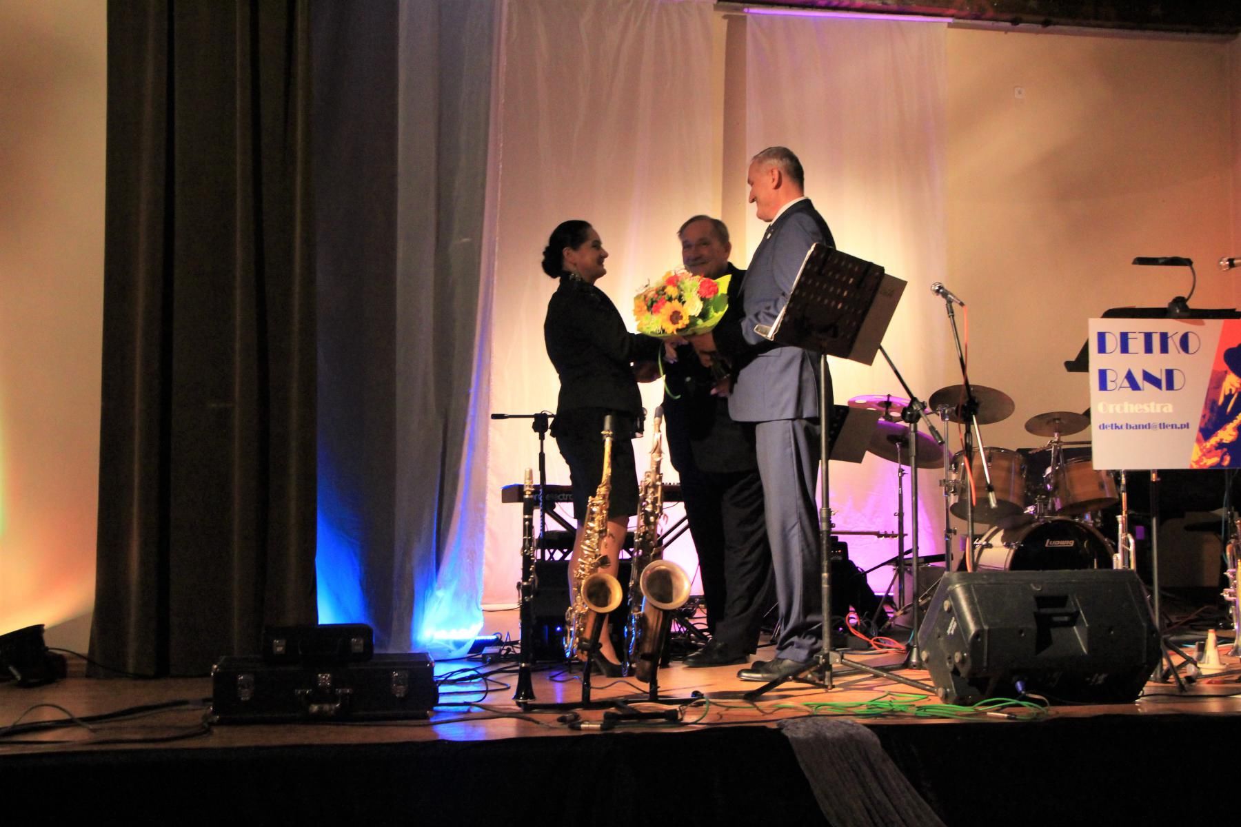 Burmistrz Olsztynka wspólnie z Przewodniczącym Rady Miejskiej Andrzejem Wojdą wręczyli symboliczną wiązankę kwiatów na ręce Katarzyny Waluk Dyrektor Miejskiego Domu Kultury w Olsztynku.