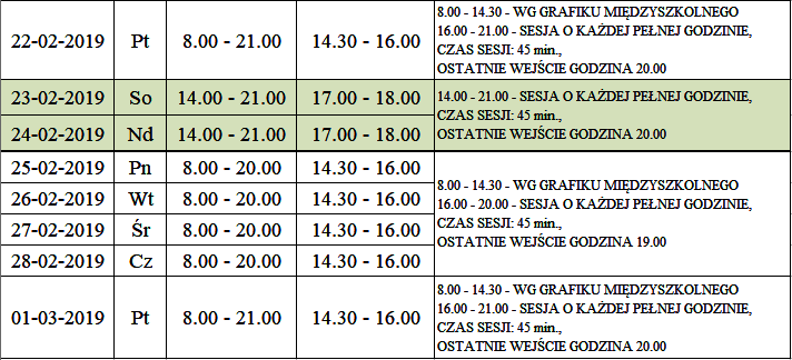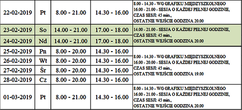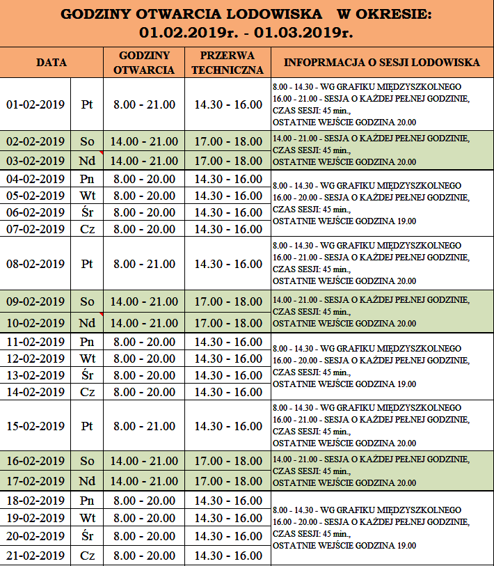 Godziny otwarcia lodowiska na orliku 01.02.2019 - 01.03.2019