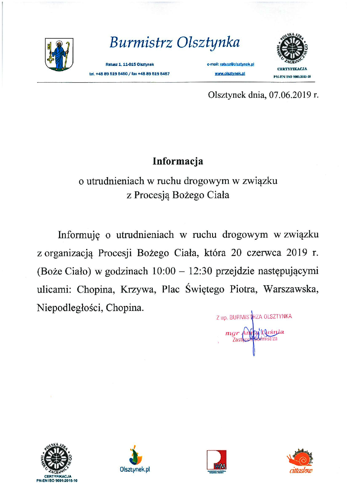 Certyfikat przyjęcia Olsztynka do Sieci Miast Cittaslow