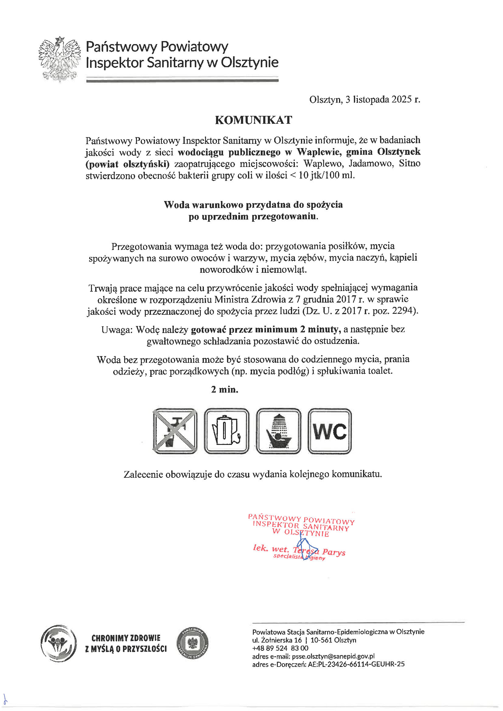 Informujemy, iż zgodnie z komunikatem Państwowego Powiatowego Inspektora Sanitarnego stwierdza się warunkową przydatność wody do spożycia z uwagi na przekroczoną zawartość bakterii grupy coli: