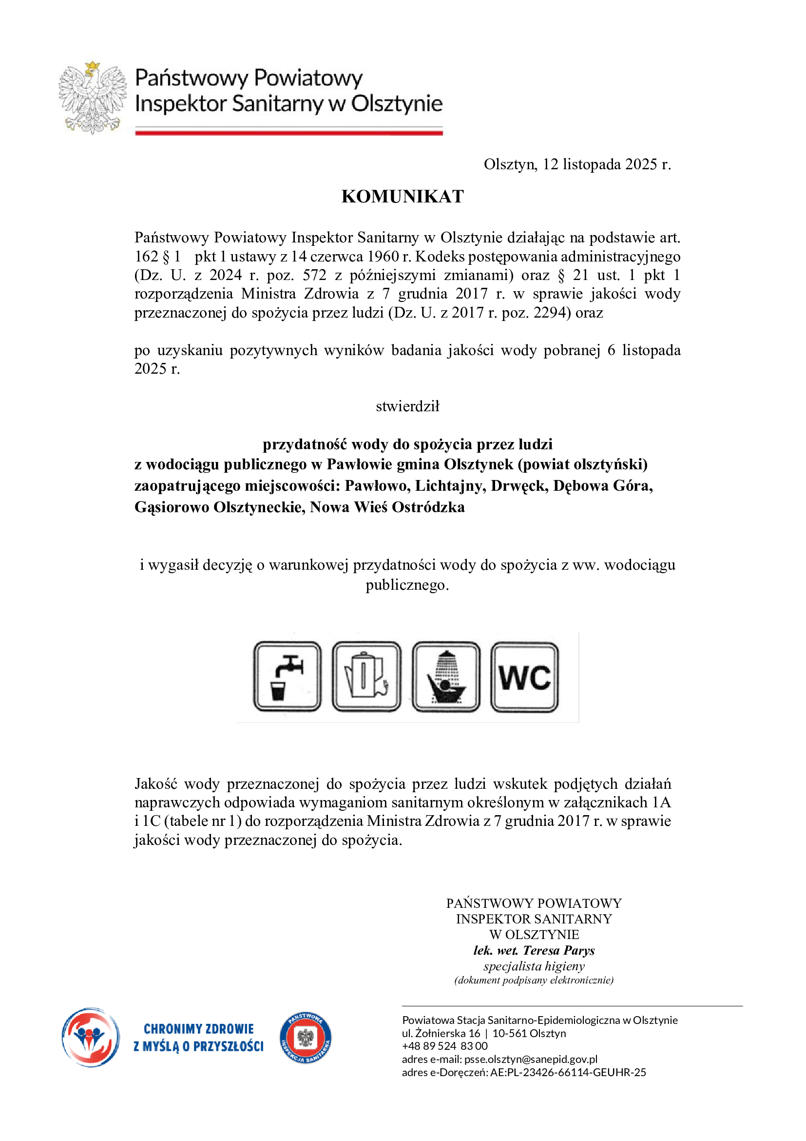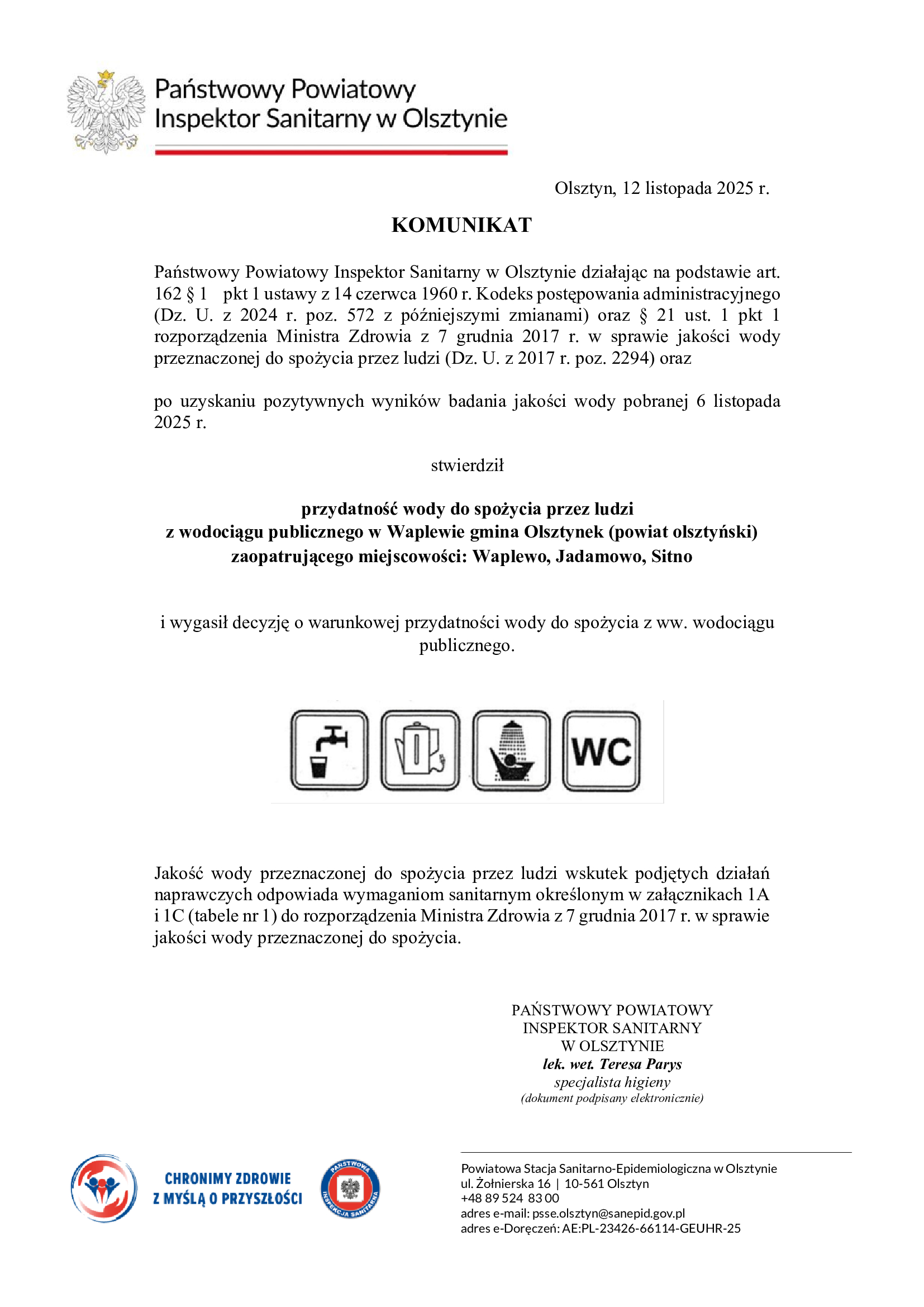 Informujemy, że zgodnie z komunikatem Państwowego Powiatowego Inspektora Sanitarnego w Olsztynie, dotyczącym przydatności wody do spożycia z wodociągu publicznego w Waplewie, obsługującego miejscowości Waplewo, Jadamowo i Sitno, oraz z wodociągu publicznego w Pawłowie, obsługującego miejscowości Pawłowo, Lichtajny, Drwęck, Dębowa Góra, Gąsiorowo Olsztyneckie i Nowa Wieś Ostródzka, uzyskano pozytywne wyniki badań jakości wody pobranej 6 listopada 2025 r.