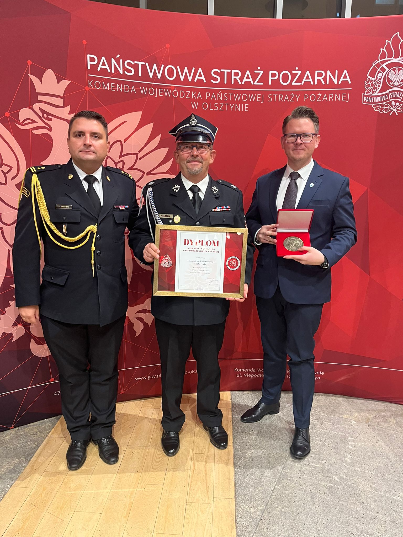 Ochotniczą Straż Pożarną w Olsztynku reprezentowali Prezes jednostki Mirosław Brokos oraz Burmistrz Olsztynka Robert Waraksa. Podczas gali OSP Olsztynek została wyróżniona pamiątkowym dyplomem Komendanta Głównego Państwowej Straży Pożarnej oraz okolicznościowym medalem.