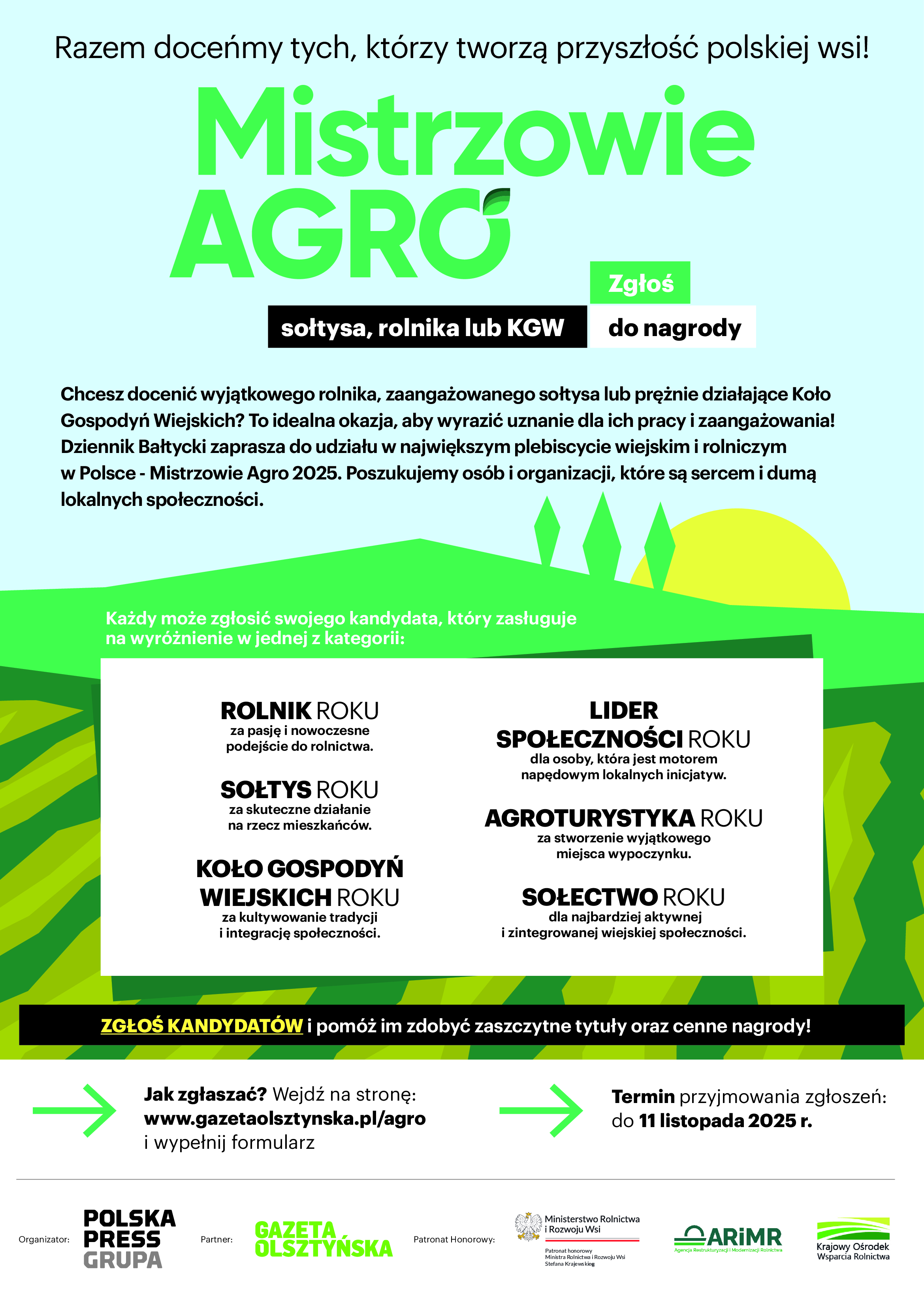 Rozpoczyna się ogólnopolski plebiscyt „Mistrzowie Agro 2025”, organizowany przez redakcję „Gazety Olsztyńskiej” oraz „Polski Metropolii Warszawskiej”, pod patronatem Ministra Rolnictwa i Rozwoju Wsi Stefana Krajewskiego oraz Prezesa Agencji Restrukturyzacji i Modernizacji Rolnictwa Wojciecha Legawca.