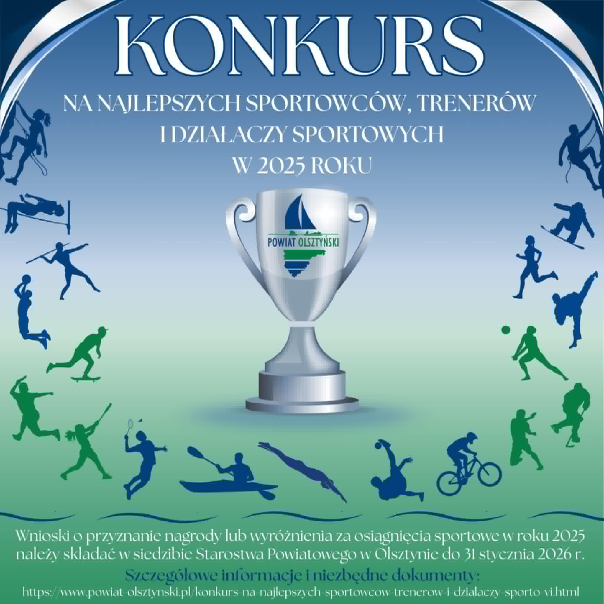 Wnioski mogą składać m.in. kluby sportowe, związki sportowe, Starosta Olsztyński oraz radni Rady Powiatu w Olsztynie. Termin składania wniosków upływa 31 stycznia 2026 roku (decyduje data wpływu do Urzędu).