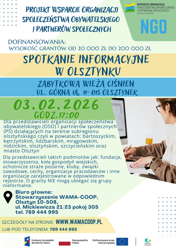 Zapraszamy na spotkanie informacyjne organizowane w ramach projektu „Wsparcie organizacji społeczeństwa obywatelskiego i partnerów społecznych”, które odbędzie się 3 lutego 2026 roku o godzinie 17:00 w zabytkowej Wieży Ciśnień przy ulicy Górnej 1A w Olsztynku.