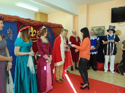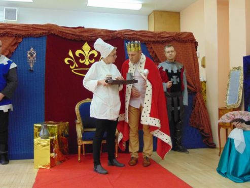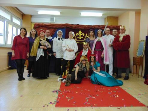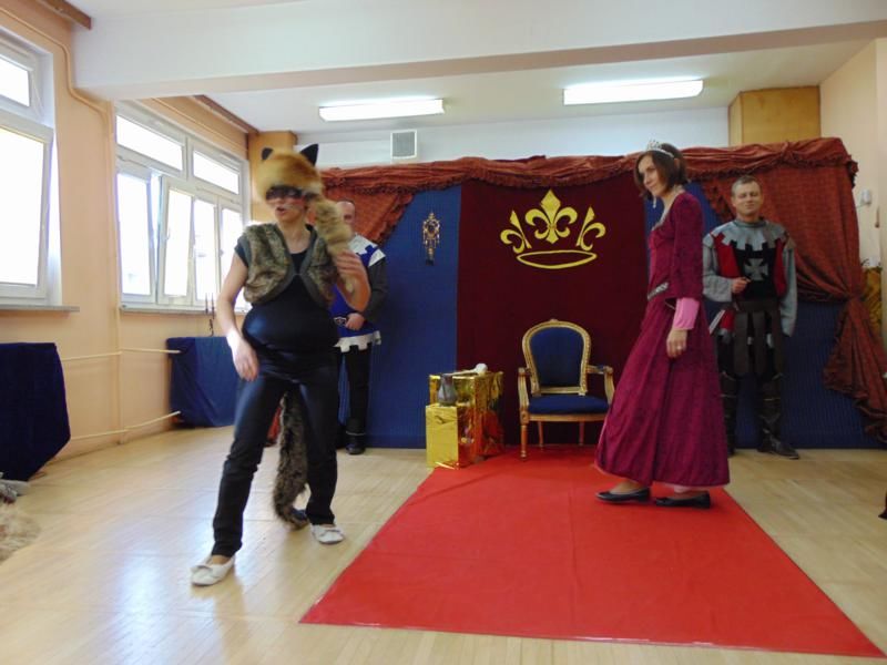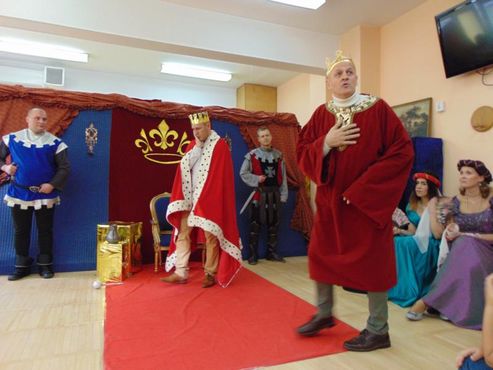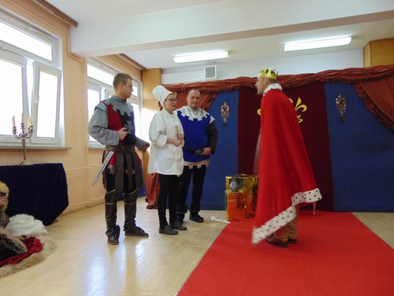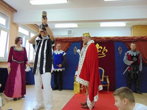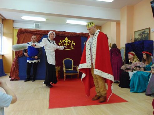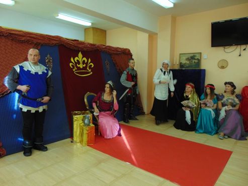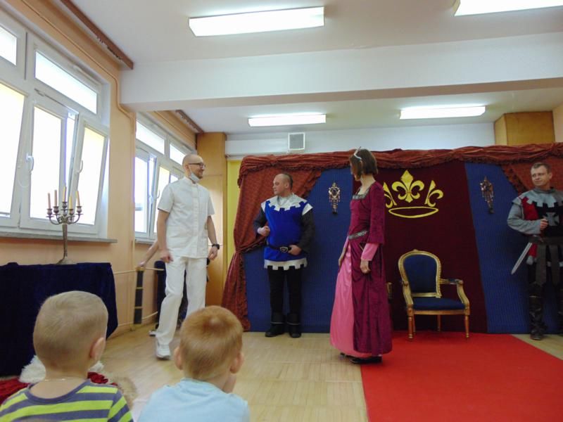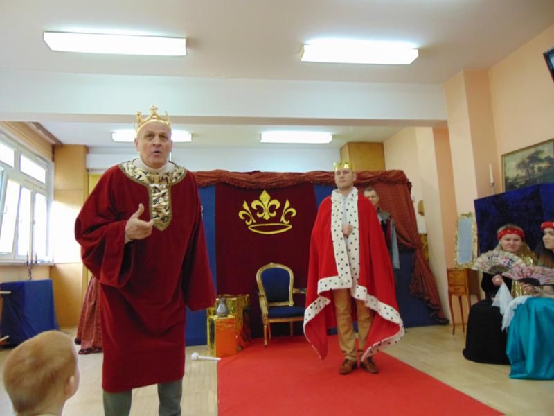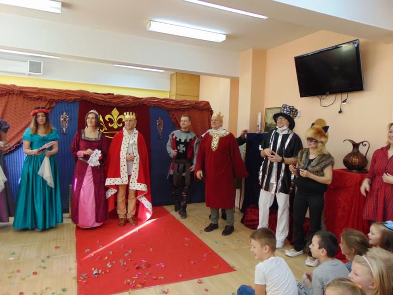 Dnia 12.02.2019r. przedszkolna sala ruchowa zamieniła się w piękną salę królewską, do której można było wejść tylko za okazaniem specjalnego biletu rycerzom trzymającym wartę przed drzwiami. Kiedy wszyscy zasiedli na widowni, rozpoczęto spektakl.