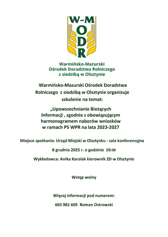 Warmińsko-Mazurski Ośrodek Doradztwa Rolniczego z siedzibą w Olsztynie zaprasza na szkolenie pn. „Upowszechnianie bieżących informacji, zgodnie z harmonogramem”.