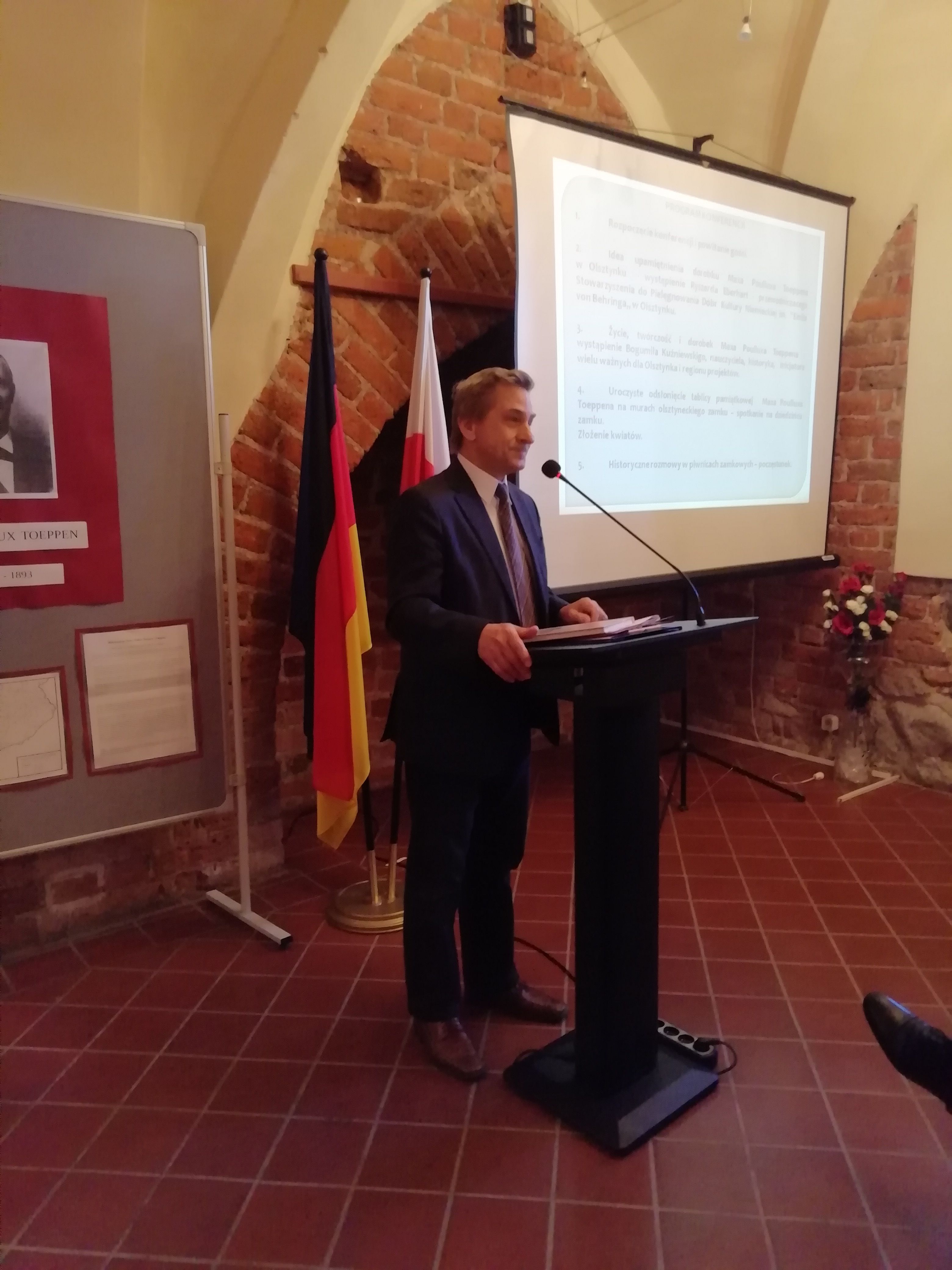 2. Idea upamiętnienia dorobku Maxa Poulluxa Toeppena w Olsztynku - wystąpienie Ryszarda Eberhart - przewodniczącego Stowarzyszenia do Pielęgnowania Dóbr Kultury Niemieckiej im. "Emila von Behringa„ w Olsztynku.