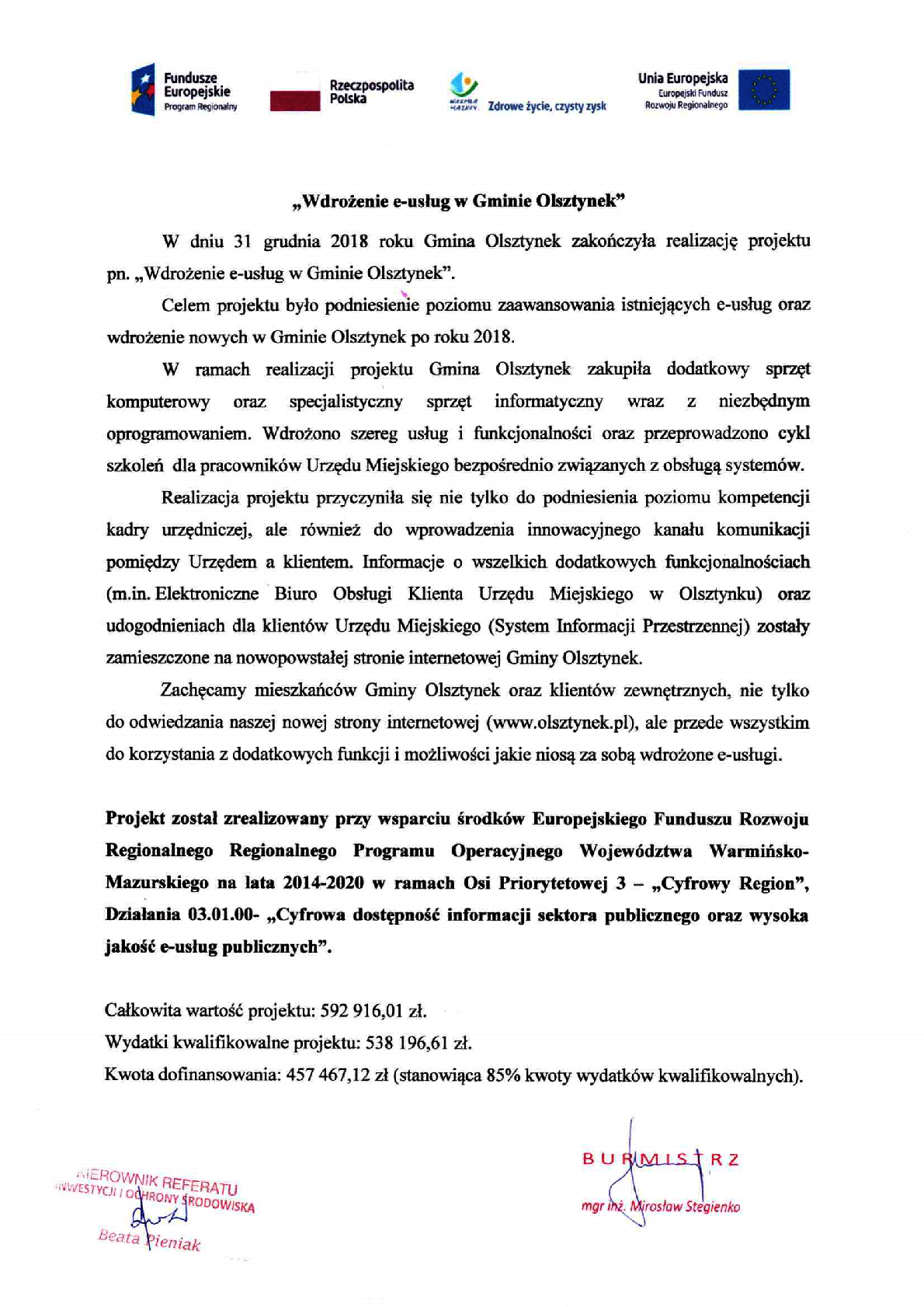 W dniu 31 grudnia 2018 roku Gmina Olsztynek zakończyła realizację projektu pn. „Wdrożenie e-usług w Gminie Olsztynek”.