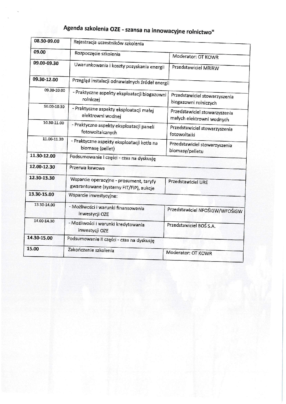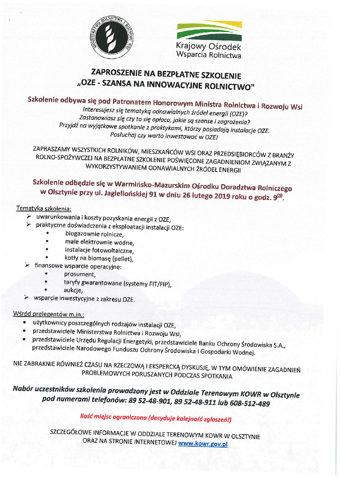 Zaproszenie na bezpłatne szkolenie - OZE Szansa na innowacyjne rolnictwo
