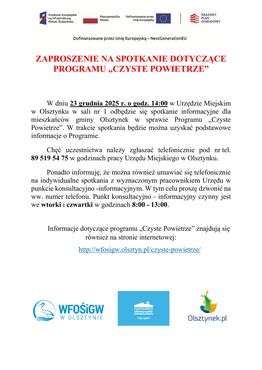 W dniu 23 grudnia 2025 r. o godz. 14:00 w Urzędzie Miejskim w Olsztynku w sali nr 1 odbędzie się spotkanie informacyjne dla mieszkańców gminy Olsztynek w sprawie Programu „Czyste Powietrze”. W trakcie spotkania będzie można uzyskać podstawowe informacje o Programie.