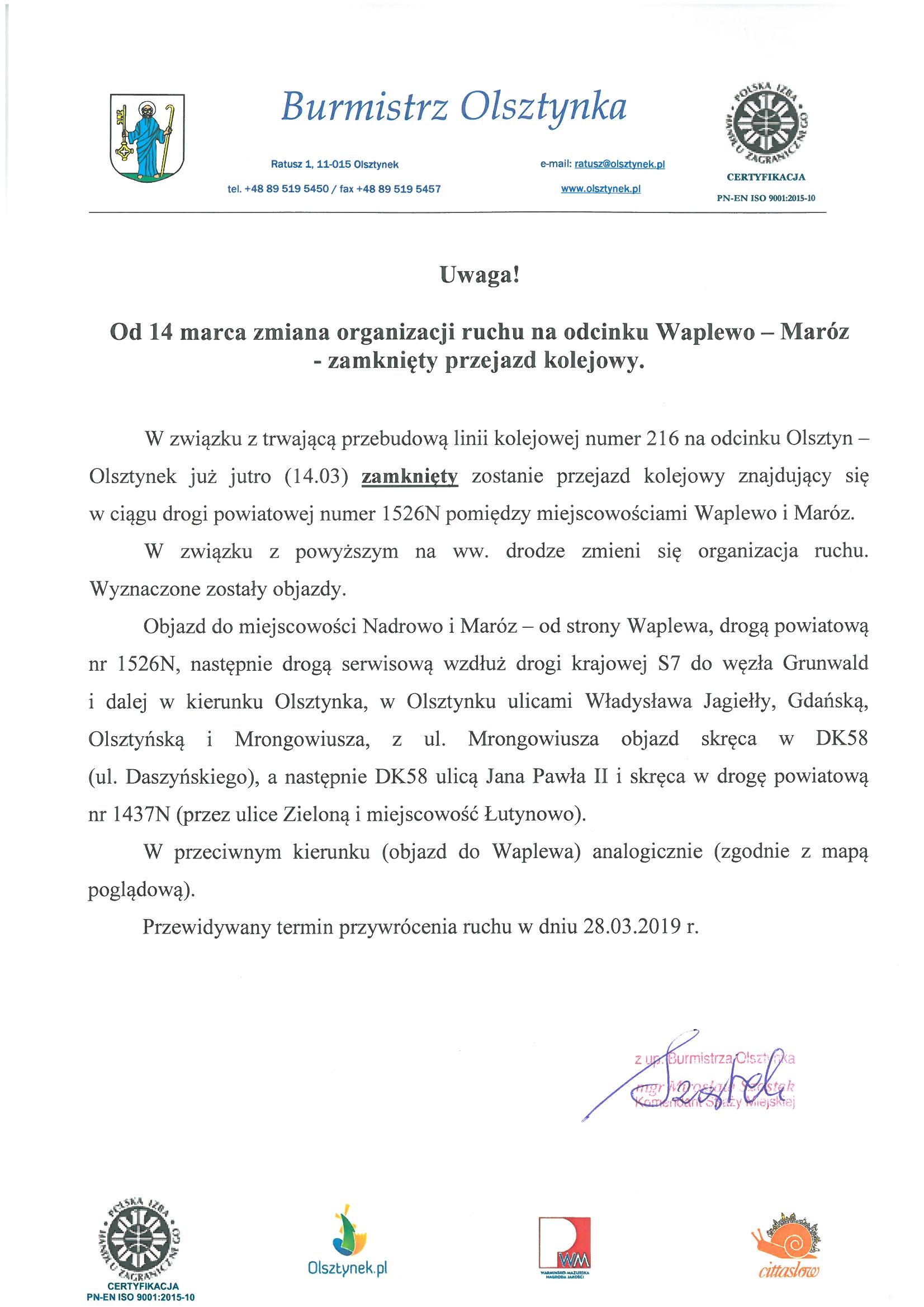 Zmiana organizacji ruchu na odcinku Waplewo - Maróz