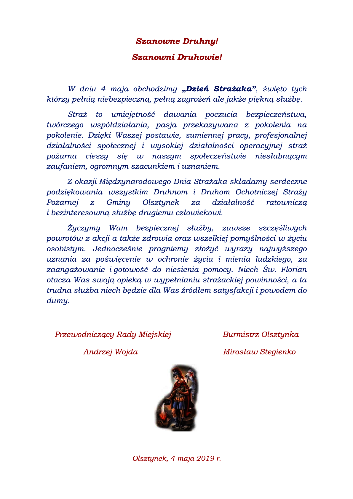 Życzenia z okazji Międzynarodowego Dnia Strażaka