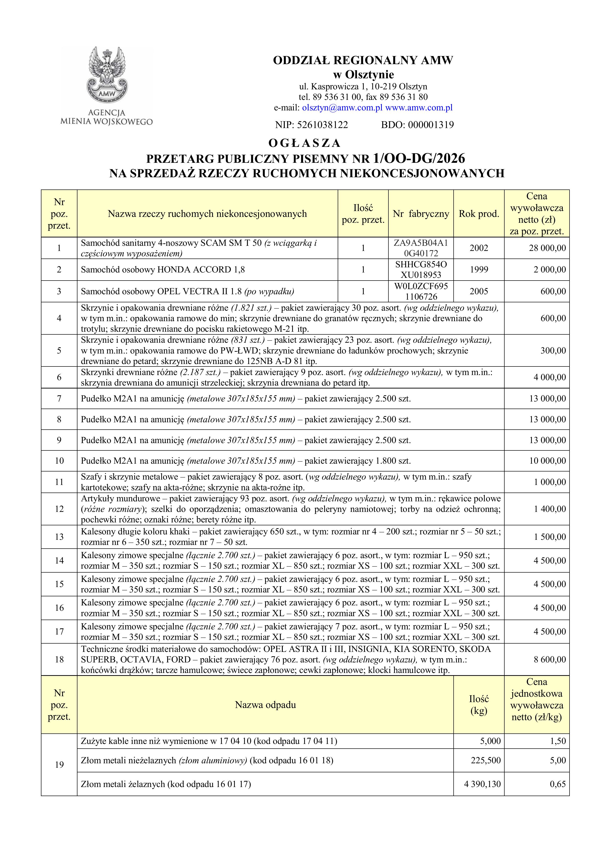 Ogłoszenie o przetargu publicznym pisemnym NR 1/OO-DG/2026 na sprzedaż rzeczy ruchomych niekoncesjonowanych